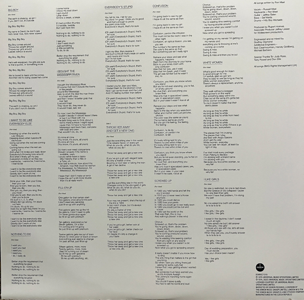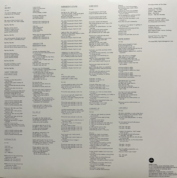Side 1: 1. Big Boy 2. I Want To Be Like Everybody Else 3. Nothing To Do 4. I Bought The Mississippi River 5. Fill-Er-Up 6. Everybody's Stupid
