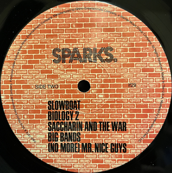 Side 2: 1. Slowboat 2. Biology 2 3. Saccharin And The War 4. Big Bands 5. (No More) Mr. Nice Guys |