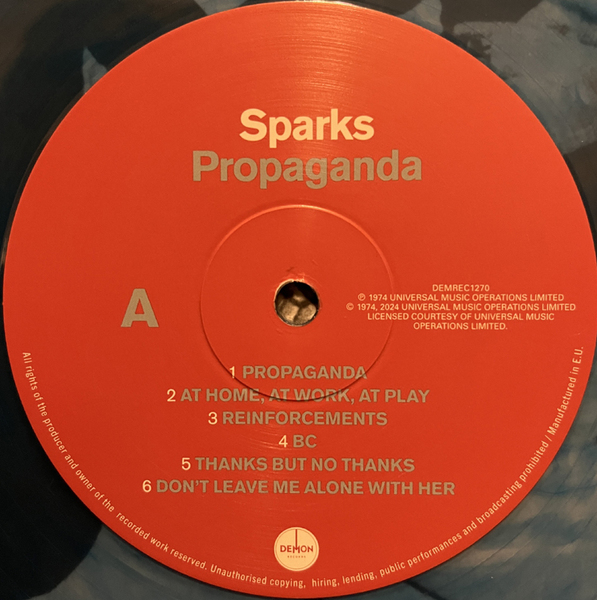 Side 1: 1. Propaganda 2. At Home, At Work, At Play 3. Reinforcements 4. B.C. 5. Thanks But No Thanks 6. Don't Leave Me Alone With Her