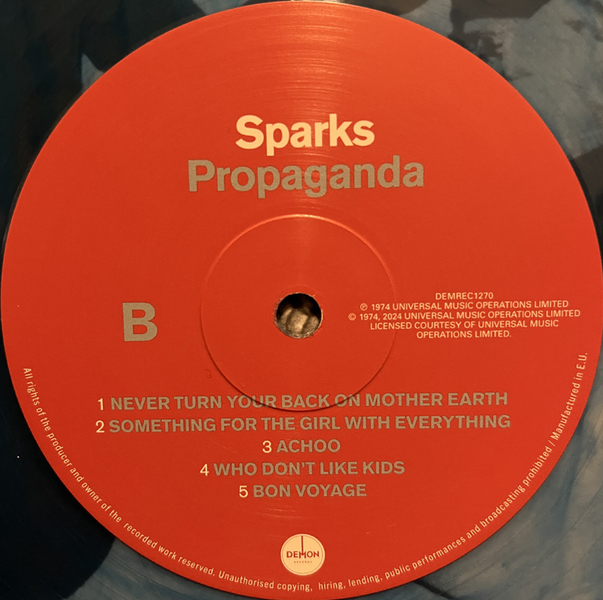 Side 2: 1. Never Turn Your Back On Mother Earth 2. Something For The Girl With Everything 3. Achoo 4. Who Don't Like Kids 5. Bon Voyage |