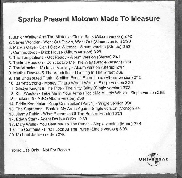 Format: C.D.R. Year: 2006 Country: U.K. Label: Motown / Universal Catalogue Number: n/a Additional 1: The CD does not include any Sparks material. It's a selection of Motown tracks chosen by Ron & Russell. Additional 2: Promo |