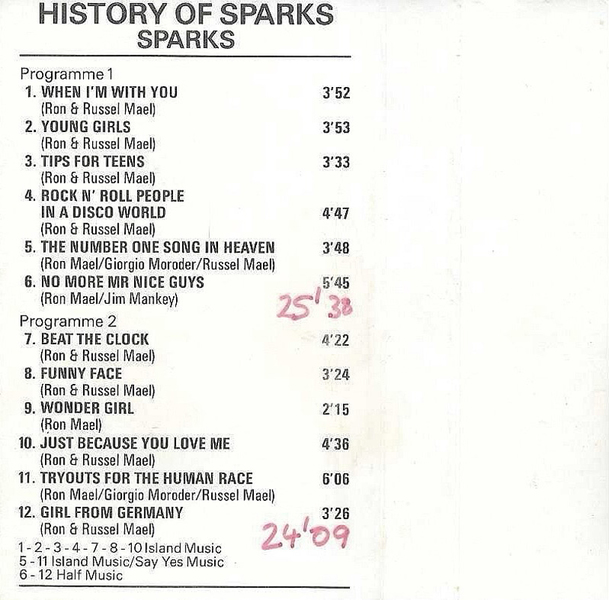 The History Of Sparks Side 1: 1. When I'm With You 2. Young Girls 3. Tips For Teens 4. Rock 'N' Roll People In A Disco World 5. The Number One Song In Heaven 6. (No More) Mr. Nice Guys